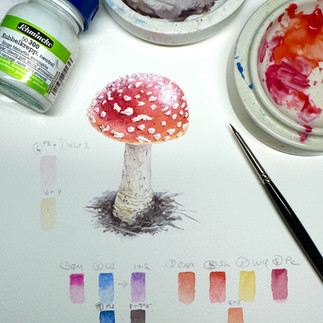 My foray into fungi painting began a few years ago after stumbling across these beautiful red capped mushrooms growing very near to my home. Since that time and from early October I always get very excited to go out looking for these mushrooms, and this year couldn't resist making a new tutorial painting this iconic red fungi.